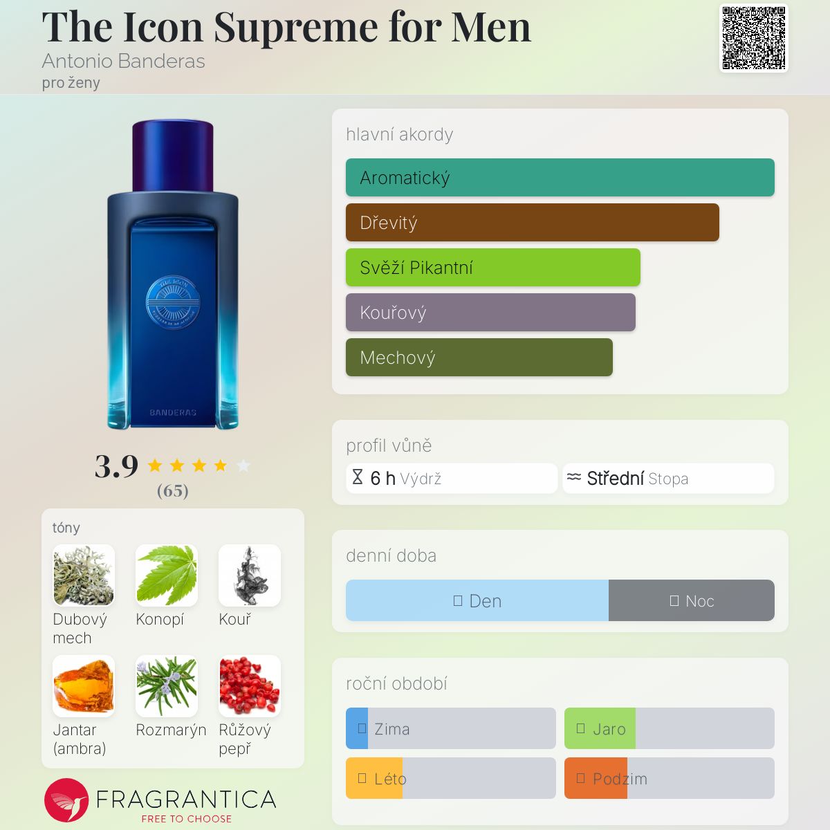 The Icon Supreme for Men podle Antonio Banderas je Aromatic Green vůně pro ženy. Toto je nová vůně. The Icon Supreme for Men byl/a uveden/a v roce 2025. Vrchní tóny jsou Růžový pepř, Bergamot, Kardamom a Neroli; střední tóny jsouKonopí, Rozmarýn, Cypřiš a Eukalyptus ; základní tóny jsou Mech, Kouř, Jantar (ambra) a Skalní růže.