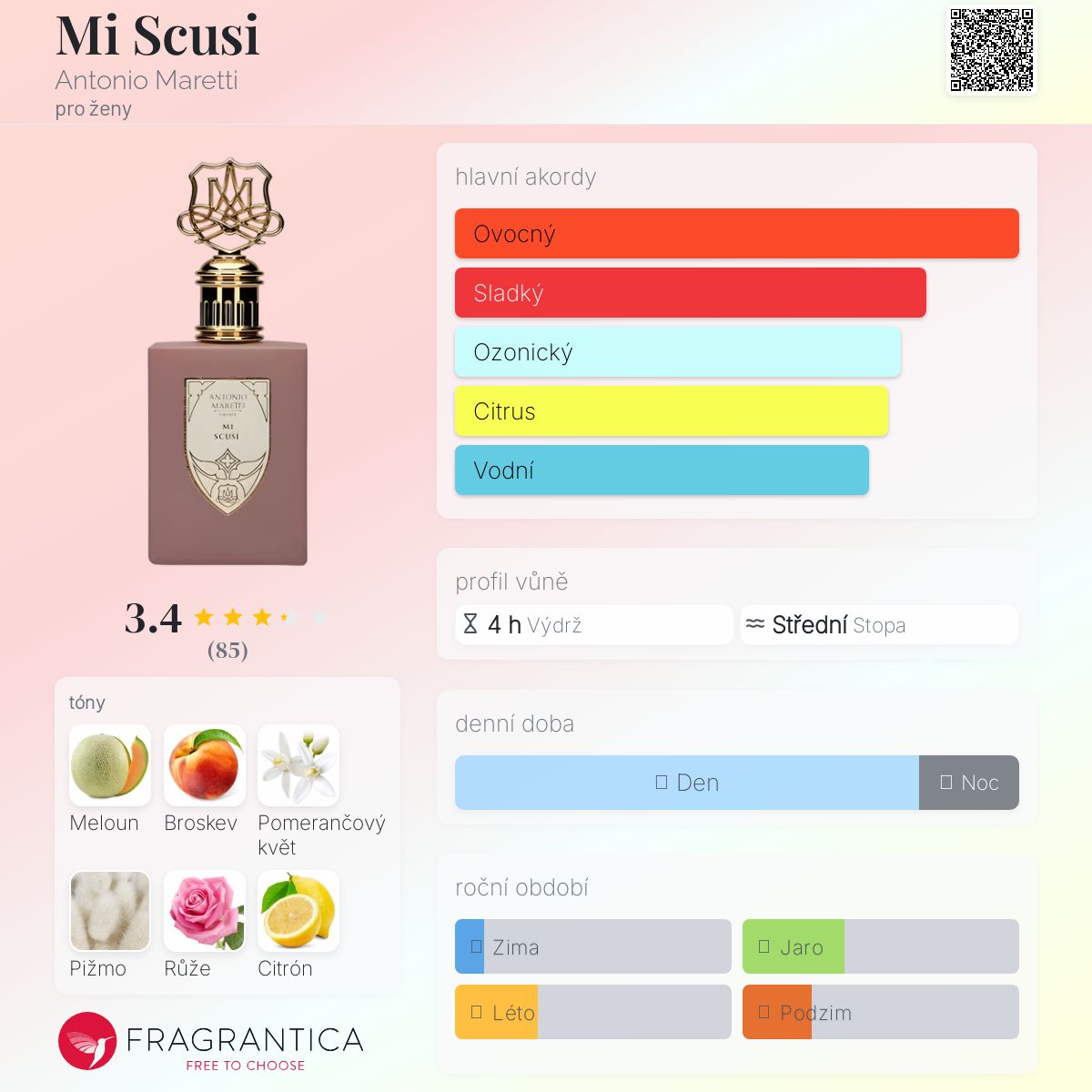 Mi Scusi podle Antonio Maretti je Floral Fruity Gourmand vůně pro ženy. Mi Scusi byl/a uveden/a v roce 2022. "Nosem" za touto vůní je Cristian Calabro. Vrchní tóny jsou Meloun, Broskev a Citrón; střední tóny jsouPomerančový květ, Růže a Maliny ; základní tóny jsou Pižmo, Mech a Pralinka.