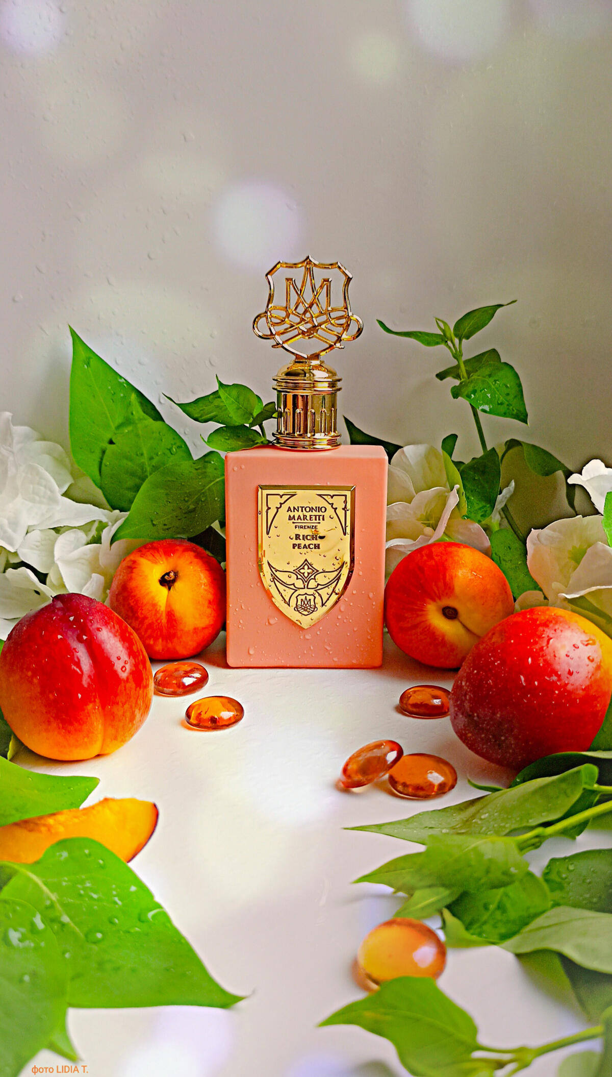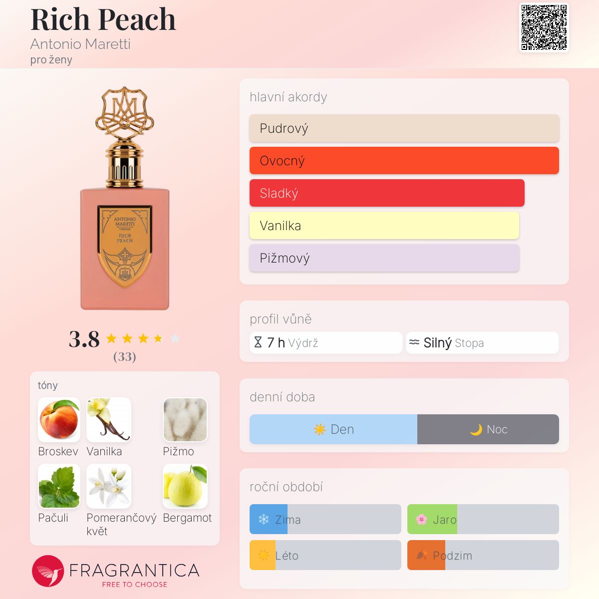 Rich Peach podle Antonio Maretti je Floral Fruity Gourmand vůně pro ženy. Rich Peach byl/a uveden/a v roce 2023. "Nosem" za touto vůní je Cristian Calabro. Vrchní tóny jsou Broskev a Bergamot; střední tóny jsouPomerančový květ, Frézie a Pivoňka ; základní tóny jsou Vanilka, Pižmo, Pačuli a Jantar (ambra).