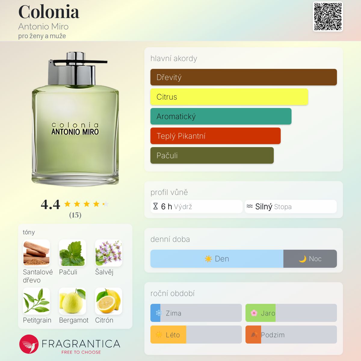 Colonia podle Antonio Miro je Citrus Aromatic vůně pro ženy a muže. Colonia byl/a uveden/a v roce 2003. "Nosem" za touto vůní je Ramon Monegal. Vrchní tóny jsou Petitgrain, Bergamot, Citron amalfi a Mandarinka; střední tóny jsouŠalvěj a Černý rybíz ; základní tóny jsou Santalové dřevo a Pačuli.
