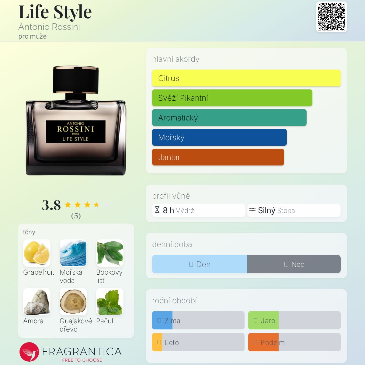 Life Style podle Antonio Rossini je Woody Aromatic vůně pro muže. Life Style byl/a uveden/a v roce 2016. Vrchní tóny jsou Grapefruit a Mořské tóny; střední tóny jsouBobkový list a Guajakové dřevo ; základní tóny jsou Ambra a Pačuli.