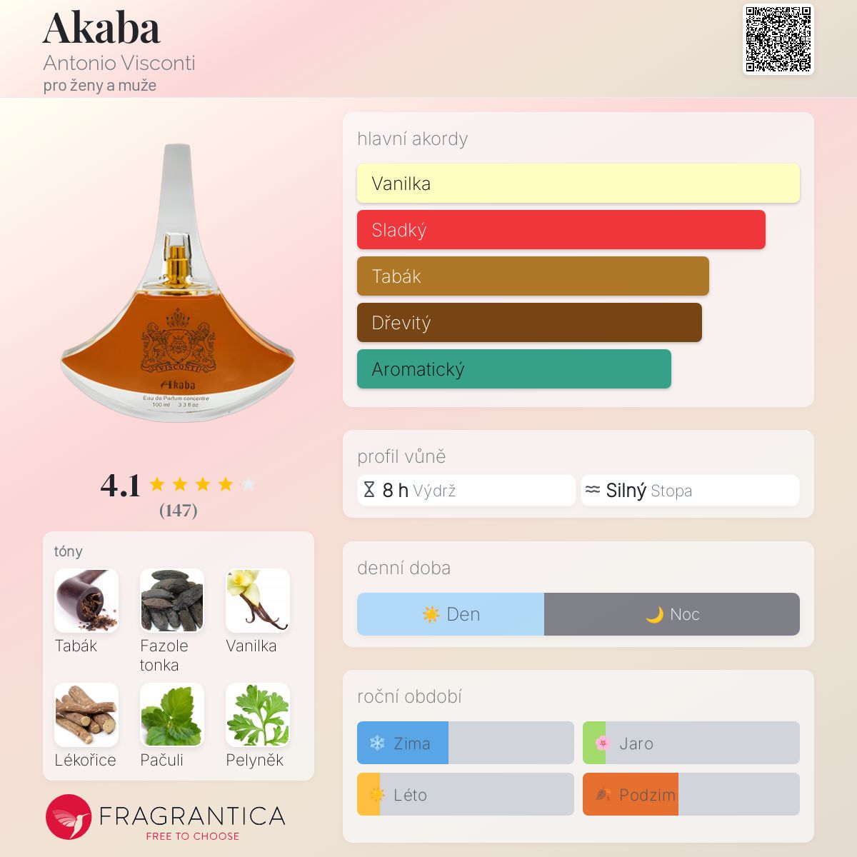Akaba podle Antonio Visconti je Orientální Woody vůně pro ženy a muže. Vrchní tóny jsou Pačuli, Pelyněk a Citron amalfi; střední tóny jsouAgarové dřevo (oud), Santalové dřevo a Virginský cedr ; základní tóny jsou Tabák, Fazole tonka, Vanilka a Lékořice.