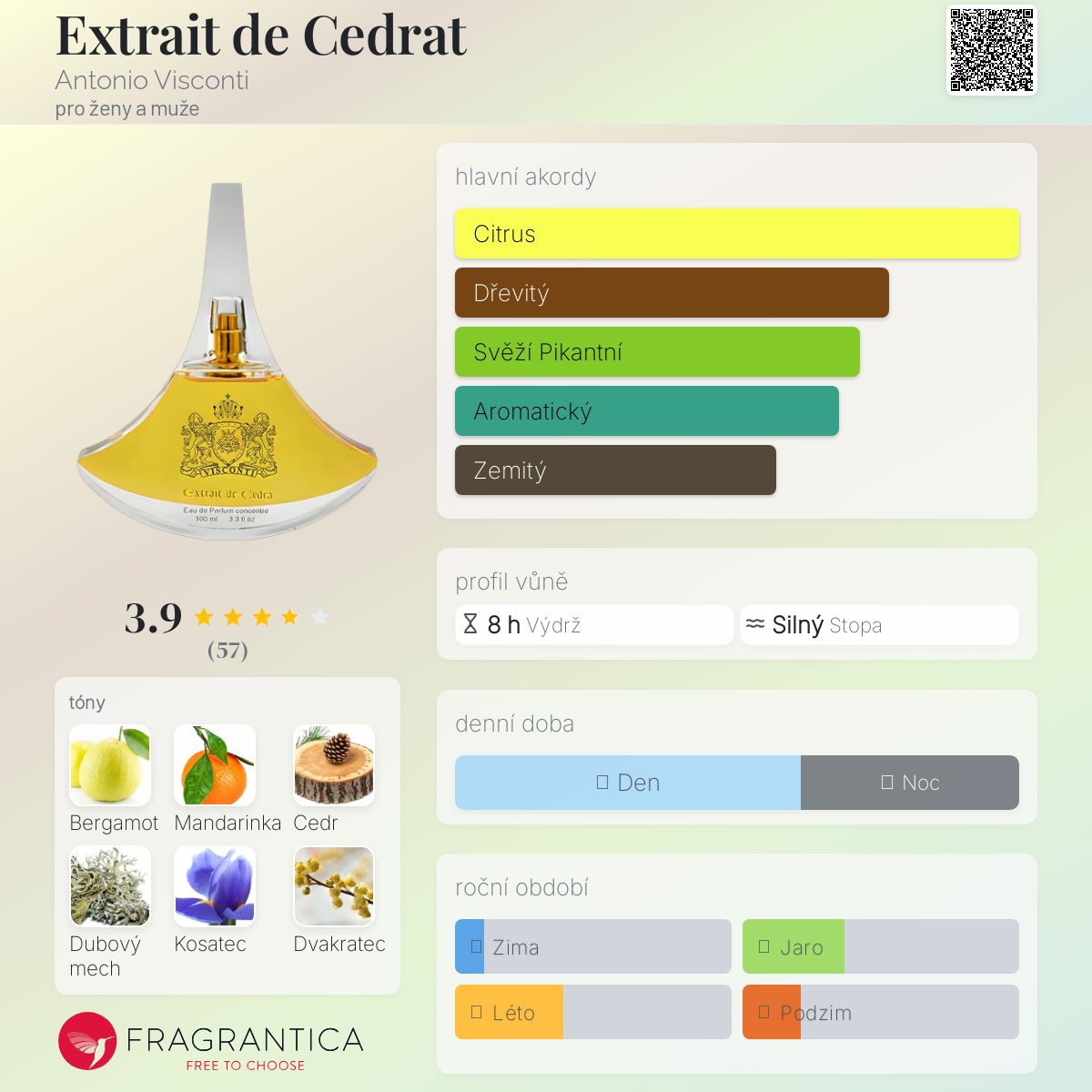 Extrait de Cedrat podle Antonio Visconti je Woody Aromatic vůně pro ženy a muže. Vrchní tóny jsou Bergamot, Mandarinka, Cedr a Bazalka; střední tóny jsouVirginský cedr, Kosatec, Dvakratec a Pačuli ; základní tóny jsou Cedr, Dubový mech, Tymián, Santalové dřevo a Agarové dřevo (oud).