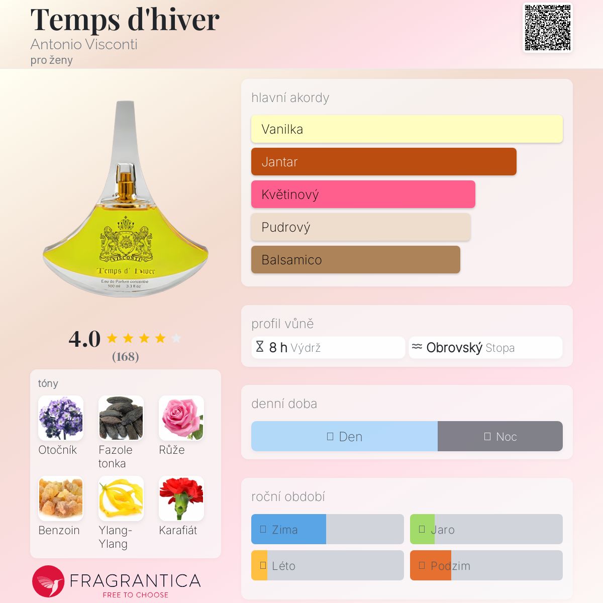 Temps d'hiver podle Antonio Visconti je Chypre Floral vůně pro ženy. Vrchní tóny jsou Růže, Karafiát a Rozmarýn; střední tóny jsouRůže, Ylang-Ylang, Galbanum a Konvalinka ; základní tóny jsou Otočník, Fazole tonka, Benzoin, Peruánský balzám a Vanilka.