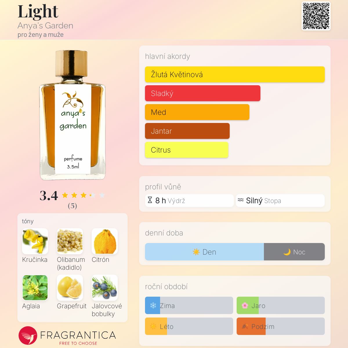 Light podle Anya's Garden je Citrus Aromatic vůně pro ženy a muže. "Nosem" za touto vůní je Anya McCoy.