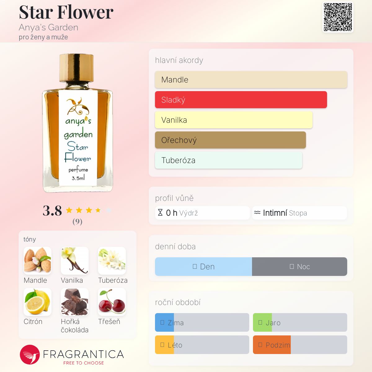 Star Flower podle Anya's Garden je Floral Fruity Gourmand vůně pro ženy a muže. Star Flower byl/a uveden/a v roce 2009. "Nosem" za touto vůní je Anya McCoy. Vrchní tóny jsou Mandle, Citron amalfi a Třešeň; střední tóny jsouTuberóza a Javor ; základní tóny jsou Vanilka a Mexická čokoláda.