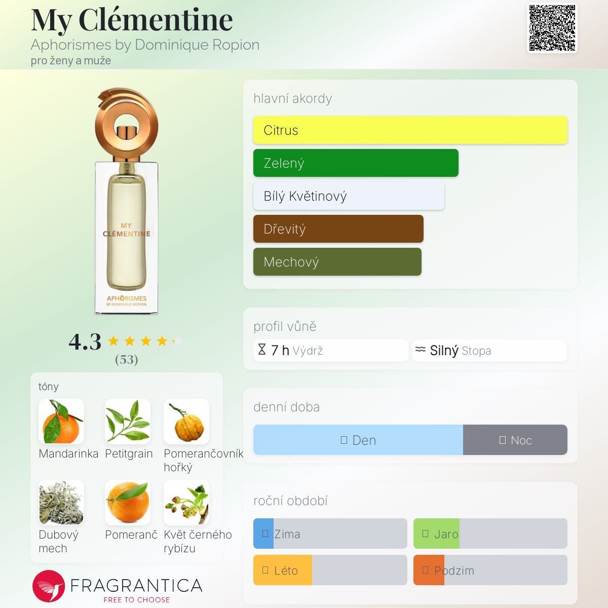 My Clémentine podle Aphorismes by Dominique Ropion je Citrus vůně pro ženy a muže. Toto je nová vůně. My Clémentine byl/a uveden/a v roce 2024. "Nosem" za touto vůní je Dominique Ropion. Vrchní tóny jsou Žlutá mandarinka, Petitgrain, Květ černého rybízu, Pomerančovník hořký, Spearmint, Sladký pomeranč, Citrón, Esence neroli a Pomerančový květ; střední tóny jsouJasmín a Fialka ; základní tóny jsou Mech, Ambra, Pačuli a Pižmo.
