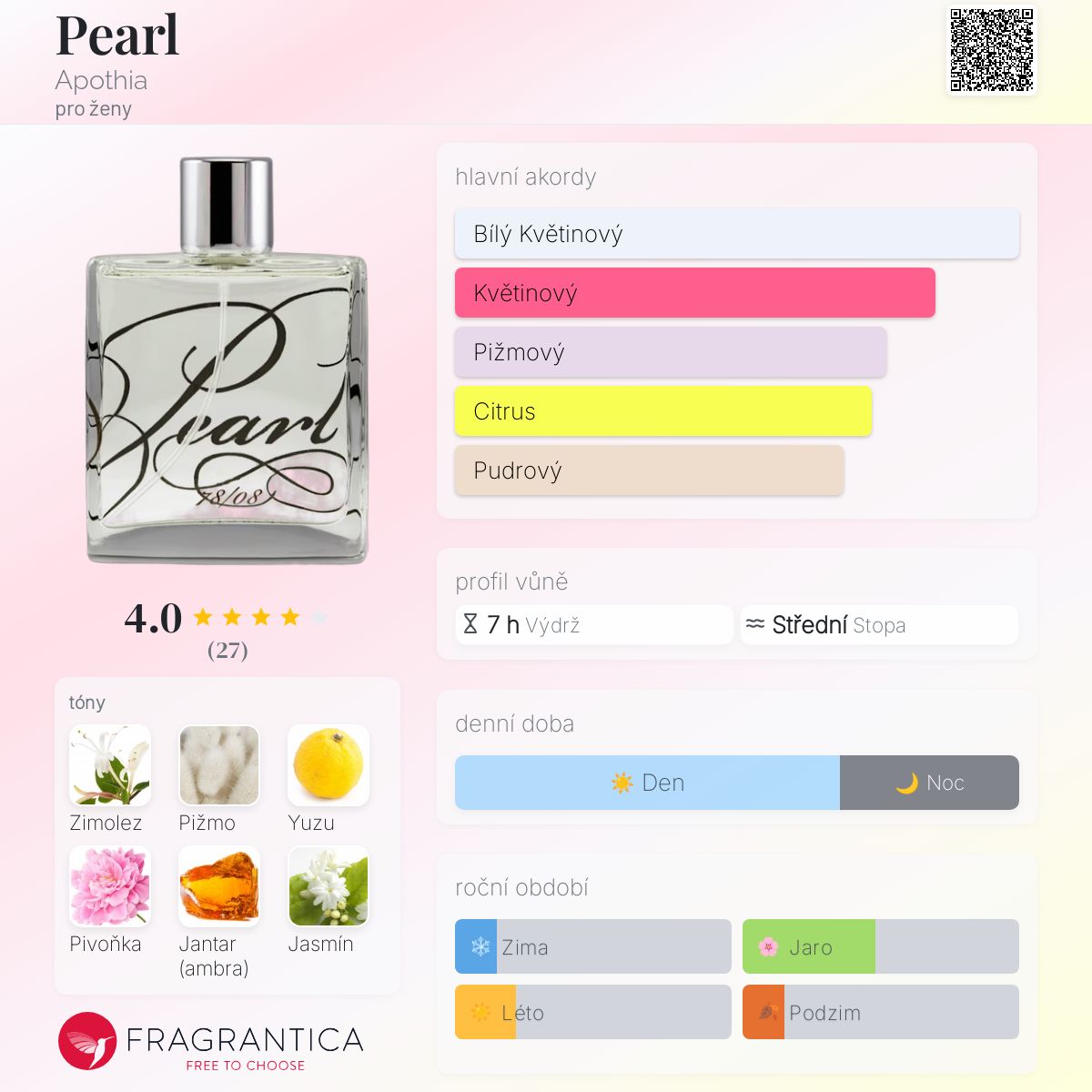 Pearl podle Apothia je Floral Woody Musk vůně pro ženy. Pearl byl/a uveden/a v roce 2009. "Nosem" za touto vůní je Stephen Nilsen. Vrchní tón je Yuzu ; střední tóny jsouZimolez, Pivoňka a Jasmín ; základní tóny jsou Pižmo, Jantar (ambra) a Kořen kosatce.