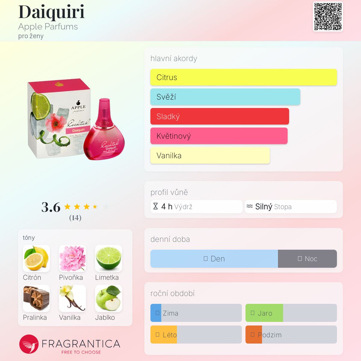 Daiquiri podle Apple Parfums je Floral Fruity vůně pro ženy. Daiquiri byl/a uveden/a v roce 2009. Vrchní tóny jsou Citrón, Limetka a Jablko; střední tóny jsouPivoňka, Pralinka a Bavlna ; základní tóny jsou Vanilka a Cedr.