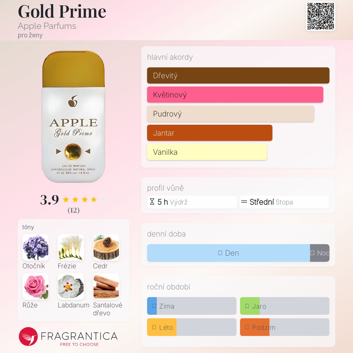 Gold Prime podle Apple Parfums je vůně pro ženy. Vrchní tóny jsou Frézie, Pepř a Jablko; střední tóny jsouOtočník, Růže, Fialka, Ibišek a Jasmín ; základní tóny jsou Extrakt z bílého cedru, Labdanum, Santalové dřevo a Kadidlo.