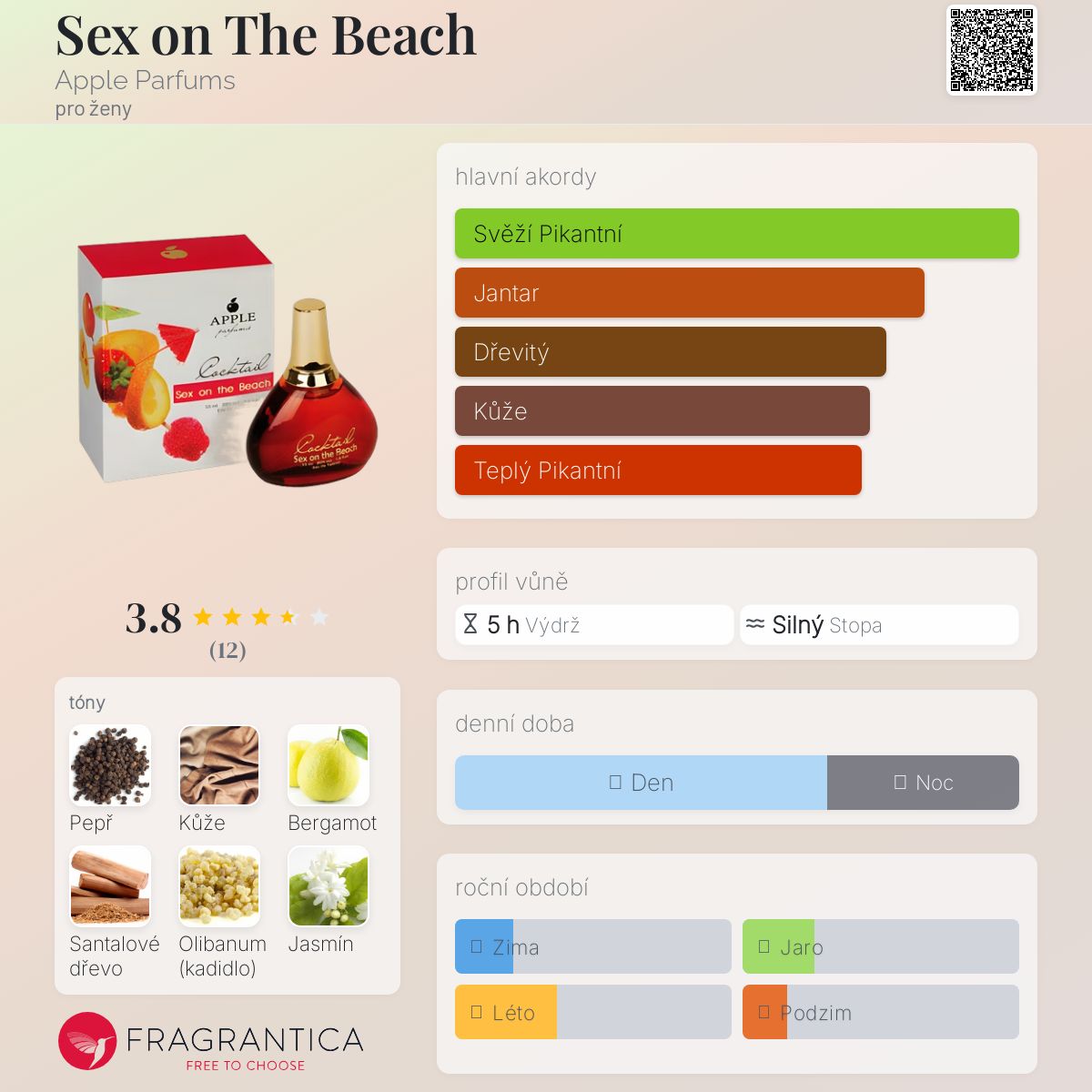 Sex on The Beach podle Apple Parfums je Orientální Floral vůně pro ženy. Sex on The Beach byl/a uveden/a v roce 2009. Vrchní tóny jsou Bergamot a Růže; střední tóny jsouPepř, Kůže, Jasmín a Frézie ; základní tóny jsou Santalové dřevo, Olibanum a Jantar (ambra).