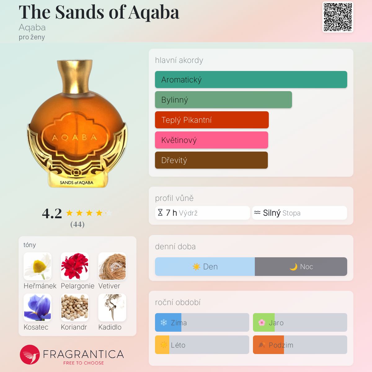 The Sands of Aqaba podle Aqaba je Floral vůně pro ženy. The Sands of Aqaba byl/a uveden/a v roce 2007. "Nosem" za touto vůní je Vito Lenoci. Vrchní tóny jsou Heřmánek, Alžírská pelargonie a Kosatec; střední tóny jsouKoriandr a Kardamom ; základní tóny jsou Vetiver, Kadidlo a Tuberóza.