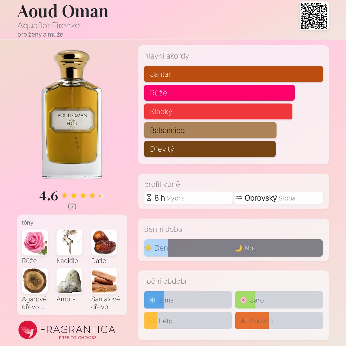 Aoud Oman podle Aquaflor Firenze je Woody Aromatic vůně pro ženy a muže. Aoud Oman byl/a uveden/a v roce 2022. "Nosem" za touto vůní je Sileno Cheloni. Vrchní tóny jsou Růže, Jasmín a Citrusy; střední tóny jsouKadidlo, Datle, Tabák a Fazole tonka ; základní tóny jsou Agarové dřevo (oud), Ambra, Santalové dřevo a Pačuli.