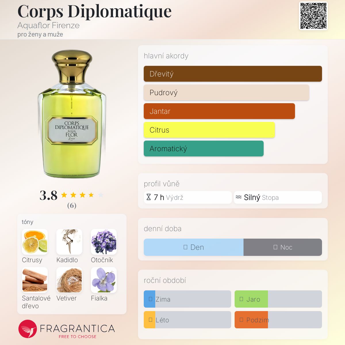 Corps Diplomatique podle Aquaflor Firenze je Citrus Aromatic vůně pro ženy a muže. Corps Diplomatique byl/a uveden/a v roce 2020. "Nosem" za touto vůní je Sileno Cheloni. Vrchní tóny jsou Citrusy a Tráva; střední tóny jsouKadidlo, Otočník a Fialka ; základní tóny jsou Santalové dřevo, Vetiver a Ambra.
