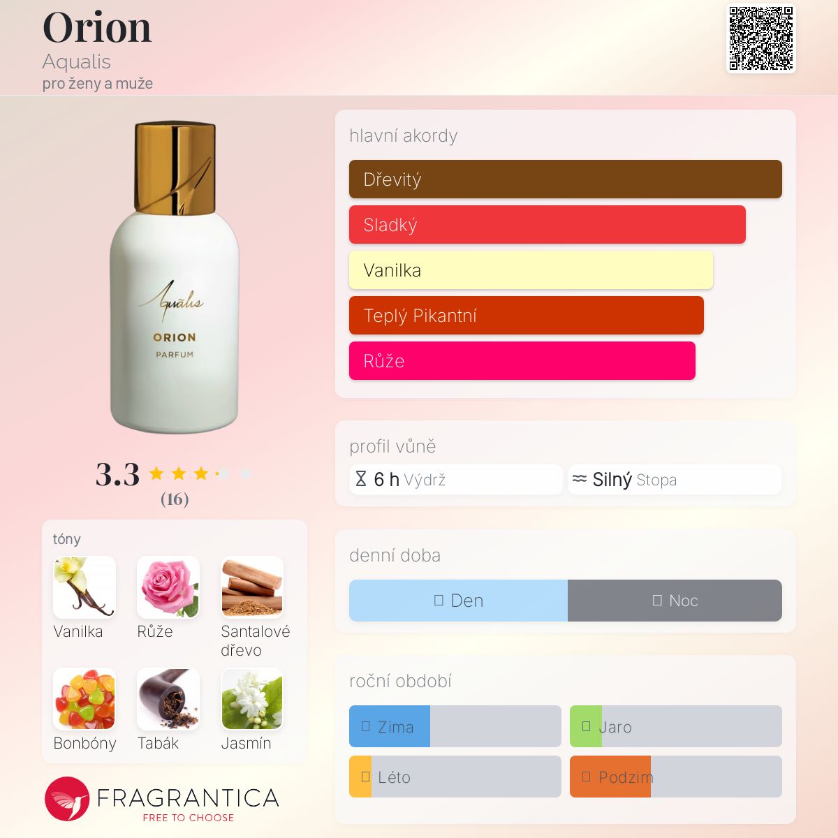 Orion podle Aqualis je Orientální Floral vůně pro ženy a muže. Orion byl/a uveden/a v roce 2020. "Nosem" za touto vůní je Amandine Galliano. Vrchní tóny jsou Růže, Sladké tóny, Jasmín a Koření; střední tóny jsouSantalové dřevo, Tabák, Pačuli, Agarové dřevo (oud) a Šafrán ; základní tóny jsou Bourbonská vanilka, Jantar (ambra), Cedr, Pižmo a Zvířecí tóny.