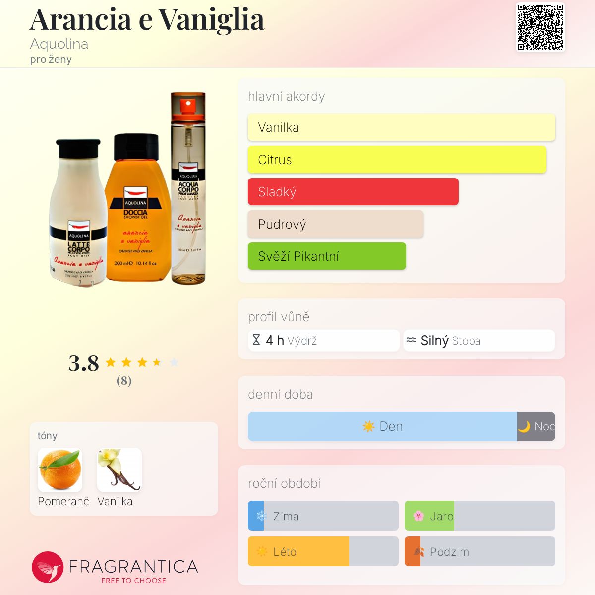 Arancia e Vaniglia podle Aquolina je Citrus Gourmand vůně pro ženy. Arancia e Vaniglia byl/a uveden/a v roce 2015.