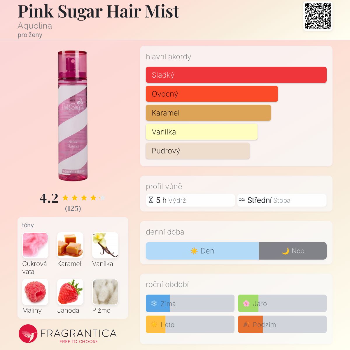 Pink Sugar Hair Mist podle Aquolina je Orientální Vanilla vůně pro ženy. Pink Sugar Hair Mist byl/a uveden/a v roce 2020. Vrchní tóny jsou Maliny, Pomeranč, Bergamot a Fíkovník; střední tóny jsouCukrová vata, Jahoda, Červené ovoce, Lékořice a Konvalinka ; základní tóny jsou Karamel, Vanilka, Pižmo, Fazole tonka a Santalové dřevo.