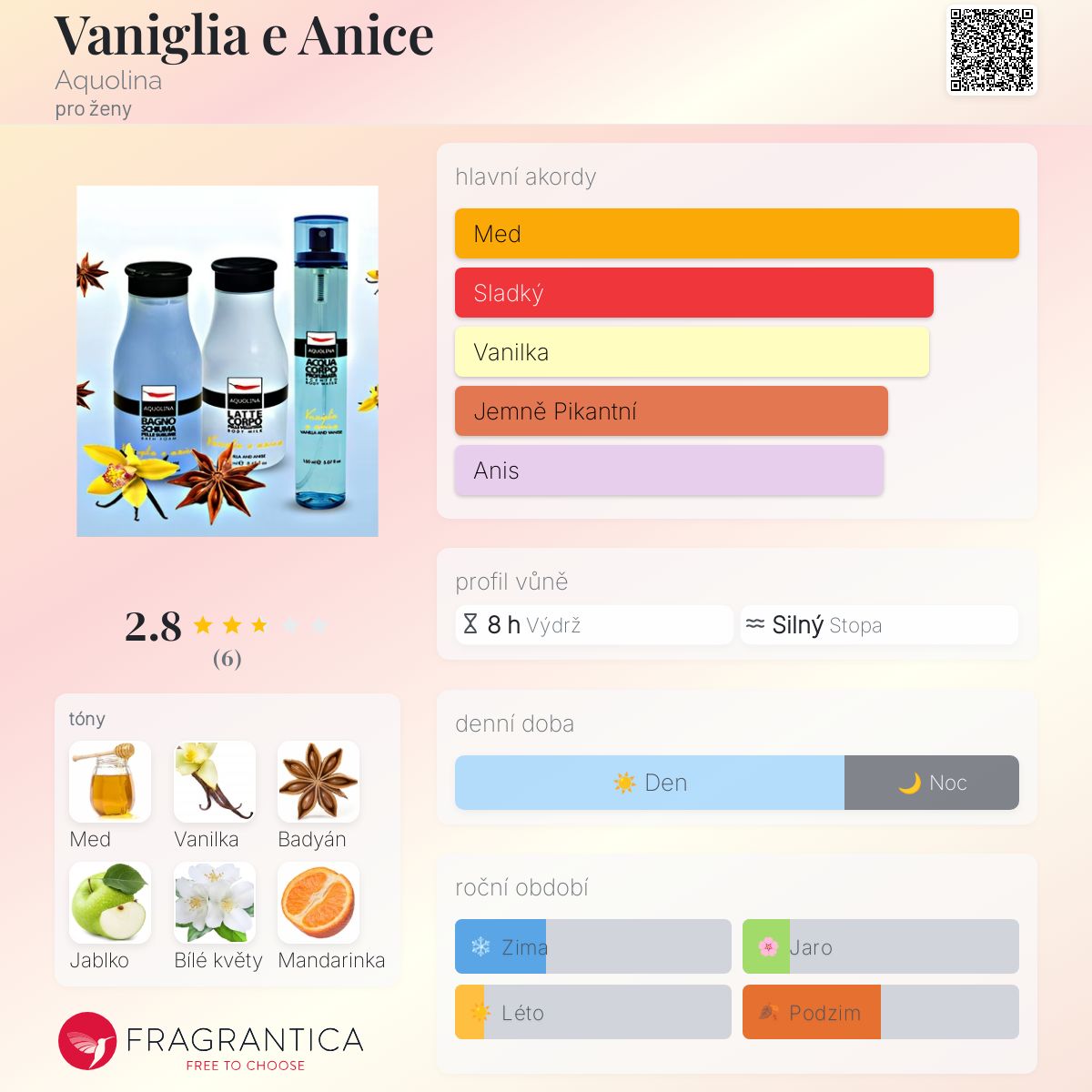 Vaniglia e Anice podle Aquolina je Floral Fruity Gourmand vůně pro ženy. Vaniglia e Anice byl/a uveden/a v roce 2015. Vrchní tóny jsou Bílý mimózový med a Bílé květy; střední tóny jsouZelené jablko a Mandarinka ; základní tóny jsou Vanilka a Badyán.