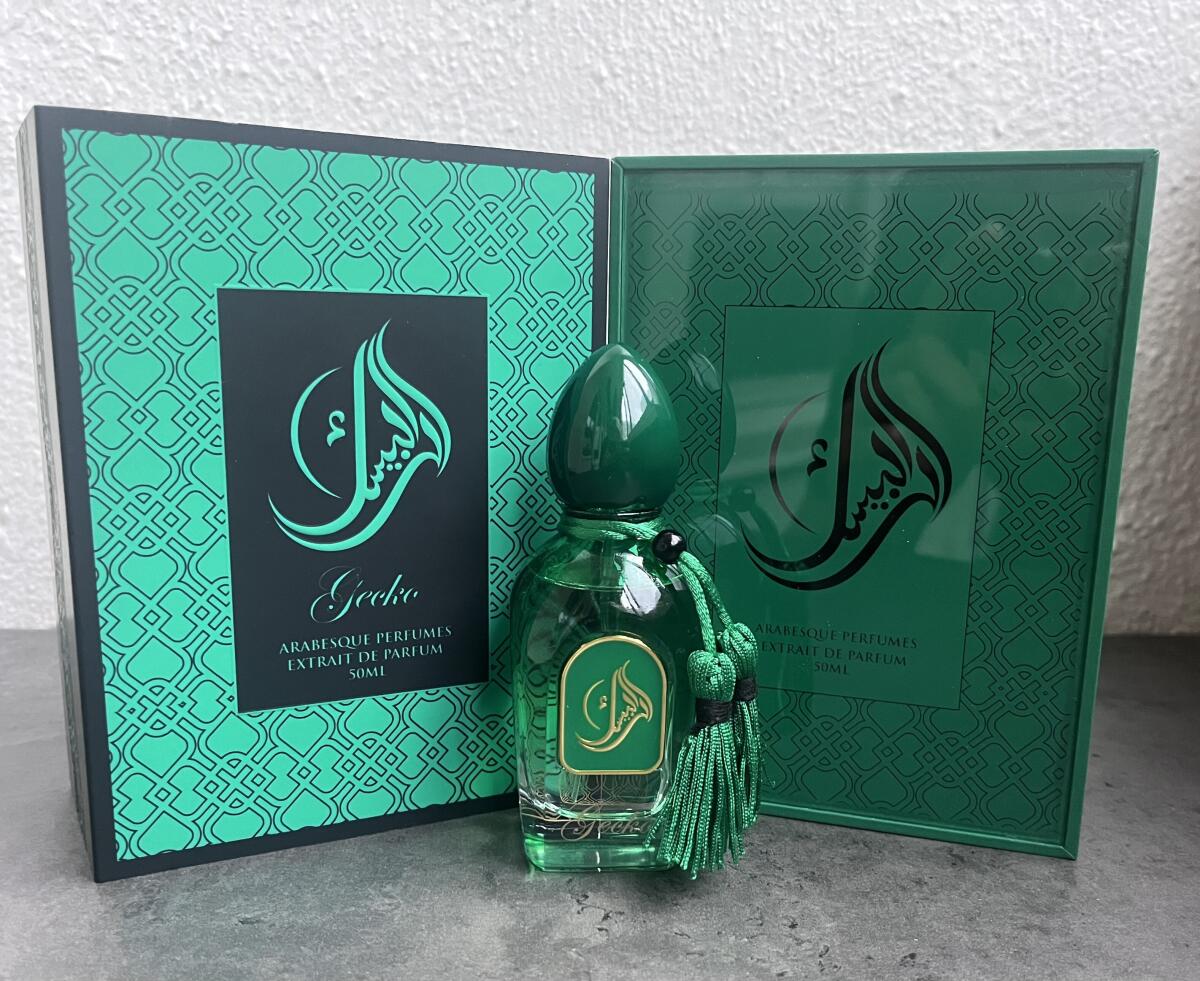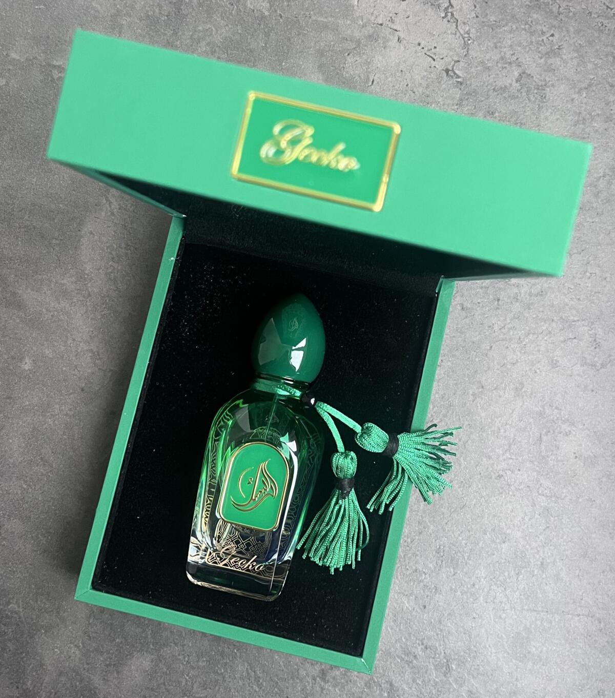 Gecko podle Arabesque Perfumes je Orientální Woody vůně pro ženy a muže. Gecko byl/a uveden/a v roce 2022. Vrchní tóny jsou Slaměnka, Bergamot, Kadidlo a Pepřovník; střední tóny jsouŠafrán, Mandarinka, Černý pepř a Kmín ; základní tóny jsou Kůže, Vonokvětka, Jantar (ambra) a Oříškové tóny.