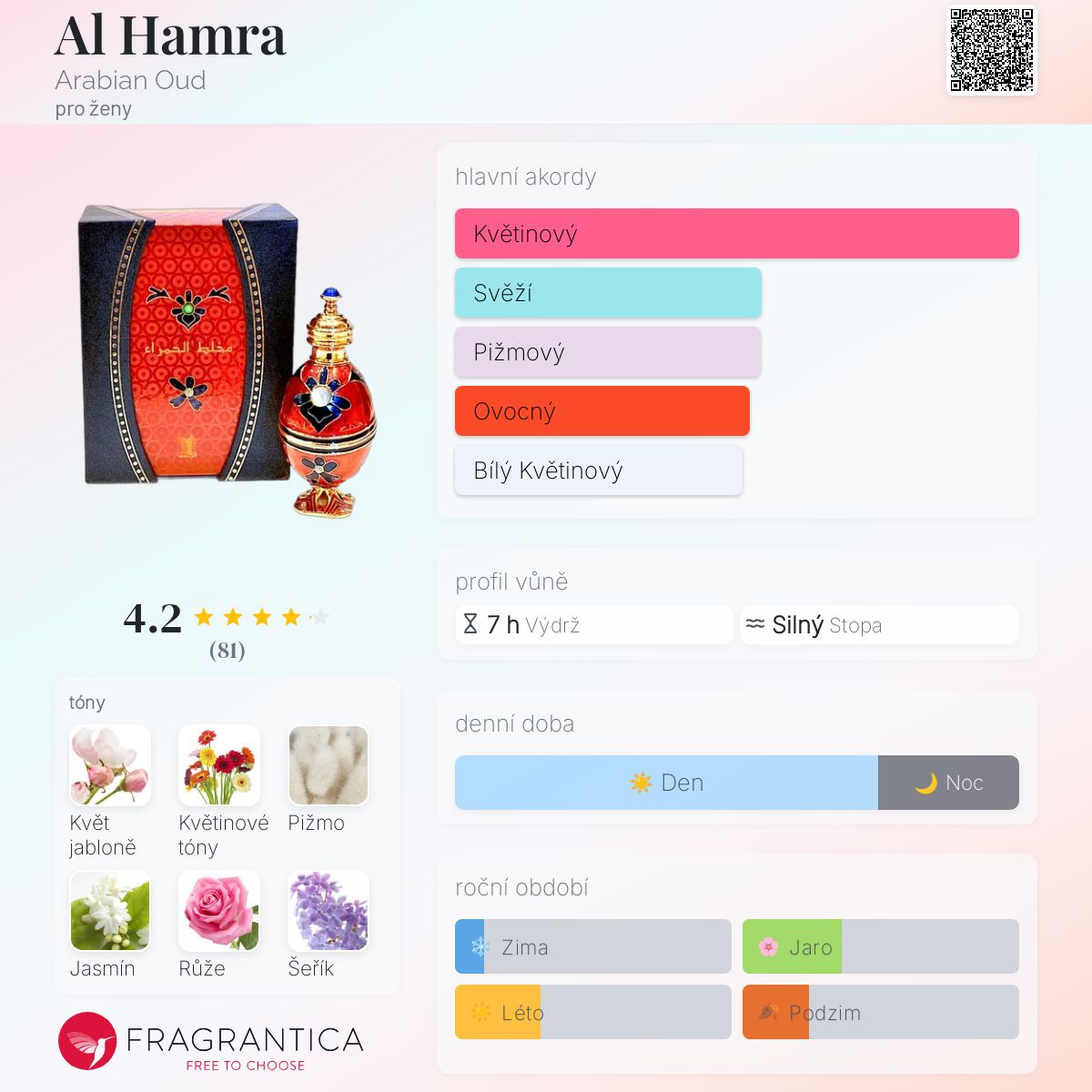 Al Hamra podle Arabian Oud je Floral vůně pro ženy. Vrchní tón je Květ jabloně ; střední tóny jsouJasmín, Růže a Šeřík ; základní tóny jsou Květinové tóny a Pižmo.