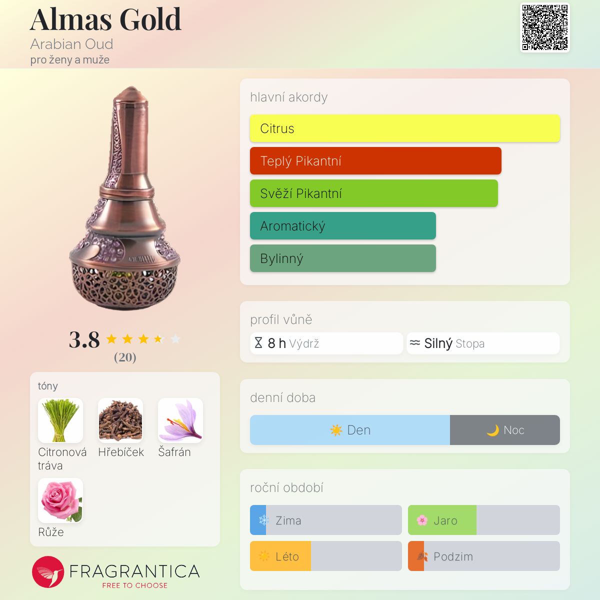 Almas Gold podle Arabian Oud je Orientální Floral vůně pro ženy a muže. Vrchní tón je Citronová tráva ; střední tóny jsouHřebíček a Šafrán ; základní tón je Růže.