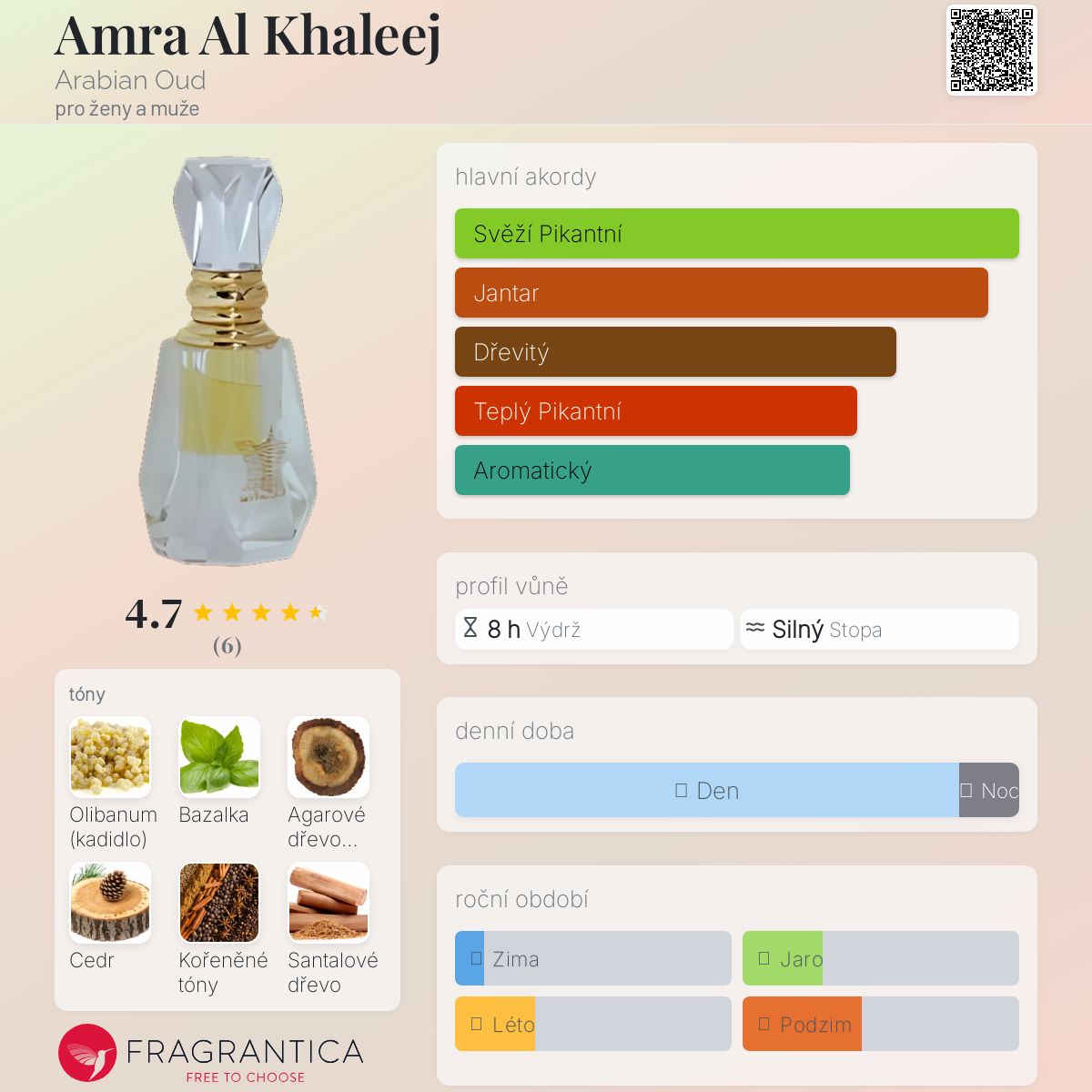Amra Al Khaleej podle Arabian Oud je Orientální Woody vůně pro ženy a muže. Vrchní tóny jsou Olibanum a Bazalka; střední tóny jsouCedr a Kořeněné tóny ; základní tóny jsou Agarové dřevo (oud) a Santalové dřevo.
