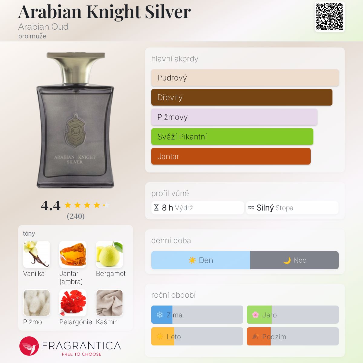 Arabian Knight Silver podle Arabian Oud je Chypre vůně pro muže. Arabian Knight Silver byl/a uveden/a v roce 2020. Vrchní tóny jsou Bergamot a Pelargónie; střední tóny jsouJantar (ambra), Kašmír a Santalové dřevo ; základní tóny jsou Vanilka, Pižmo a Pačuli.