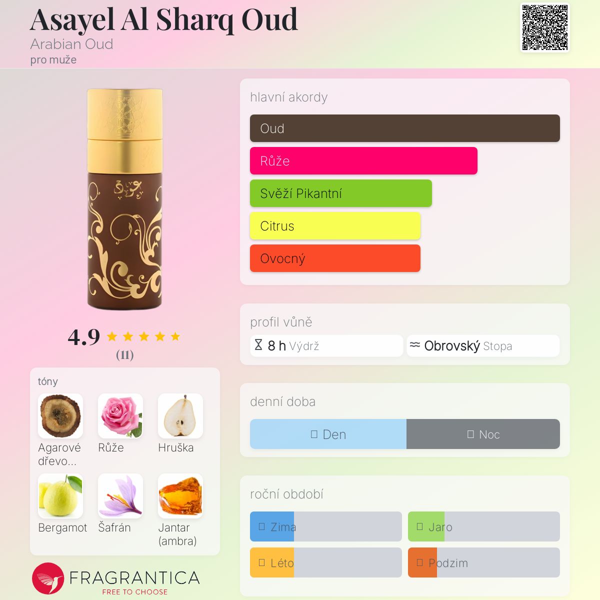 Asayel Al Sharq Oud podle Arabian Oud je Orientální vůně pro muže. Asayel Al Sharq Oud byl/a uveden/a v roce 2019. Vrchní tóny jsou Hruška a Bergamot; střední tóny jsouRůže, Šafrán a Jantar (ambra) ; základní tóny jsou Agarové dřevo (oud) a Santalové dřevo.