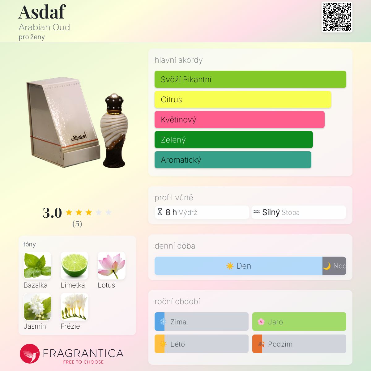 Asdaf podle Arabian Oud je Floral Green vůně pro ženy. Vrchní tón je Jasmín mnohokvětý ; střední tóny jsouBazalka a Lotus ; základní tóny jsou Limetka a Frézie.