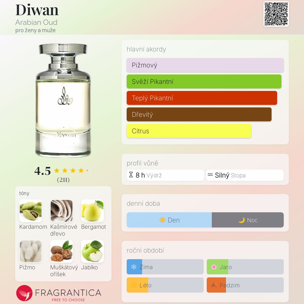Diwan je tak příjemná vůně, která v horku opravdu zazáří. Má kořeněný, ovocný úvod, který je tak dobrý a vyvážený. Právě ve střední fázi pocítíte její vzdušnou a dřevitou stránku, a to díky kašmírskému oudu, který není tak hlasitý a těžký. Vůně po zaschnutí je pižmová s lehkou sladkostí vanilky a zemitostí pačuli. Celkově je vůně velmi kvalitní a dokáže si udržet svou svěžest i po více než 8 hodinách! Ano! Dlouhověkost, siláž a projekce jsou šílené, takže pozor na rozprašovač! Také flakon a prezentace jsou bezpochyby špičkové! 👌🏼👌🏼👌🏼.
