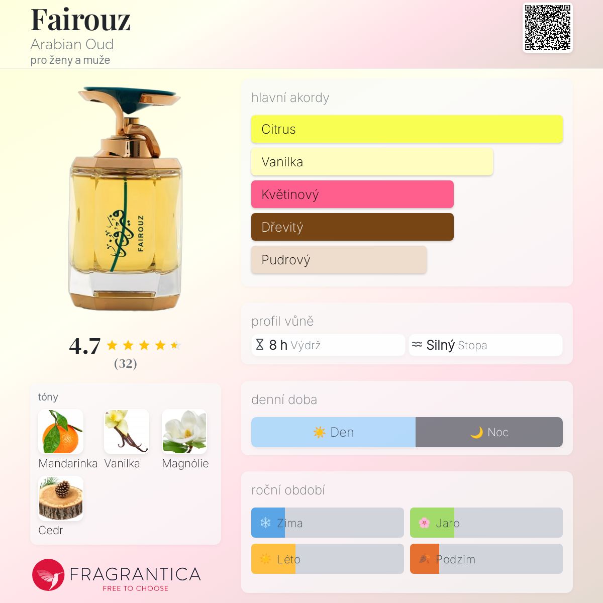 Fairouz podle Arabian Oud je vůně pro ženy a muže. Vrchní tón je Italská mandarinka ; střední tón jeMagnólie ; základní tóny jsou Vanilka a Cedr.