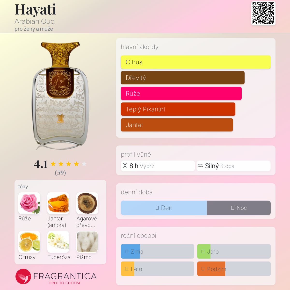 Hayati podle Arabian Oud je Orientální vůně pro ženy a muže. Vrchní tóny jsou Růže, Citrusy, Tuberóza, Mandarinka a Bergamot; střední tóny jsouJantar (ambra), Santalové dřevo, Pačuli a Vetiver ; základní tóny jsou Agarové dřevo (oud), Pižmo a Kardamom.