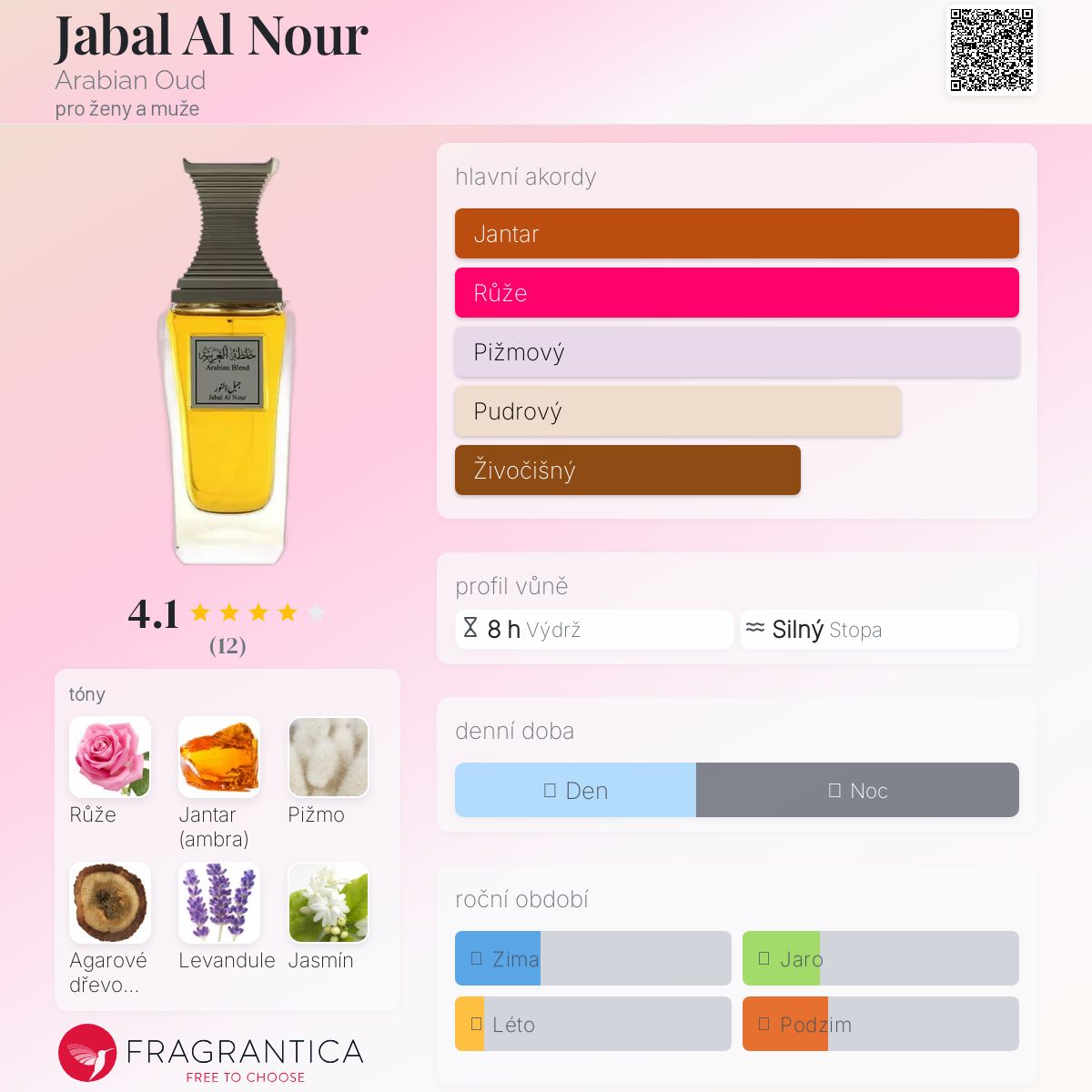 Jabal Al Nour podle Arabian Oud je Orientální Floral vůně pro ženy a muže. Jabal Al Nour byl/a uveden/a v roce 2023. Vrchní tón je Levandule ; střední tóny jsouRůže, Agarové dřevo (oud) a Jasmín ; základní tóny jsou Jantar (ambra), Pižmo a Dřevité tóny.