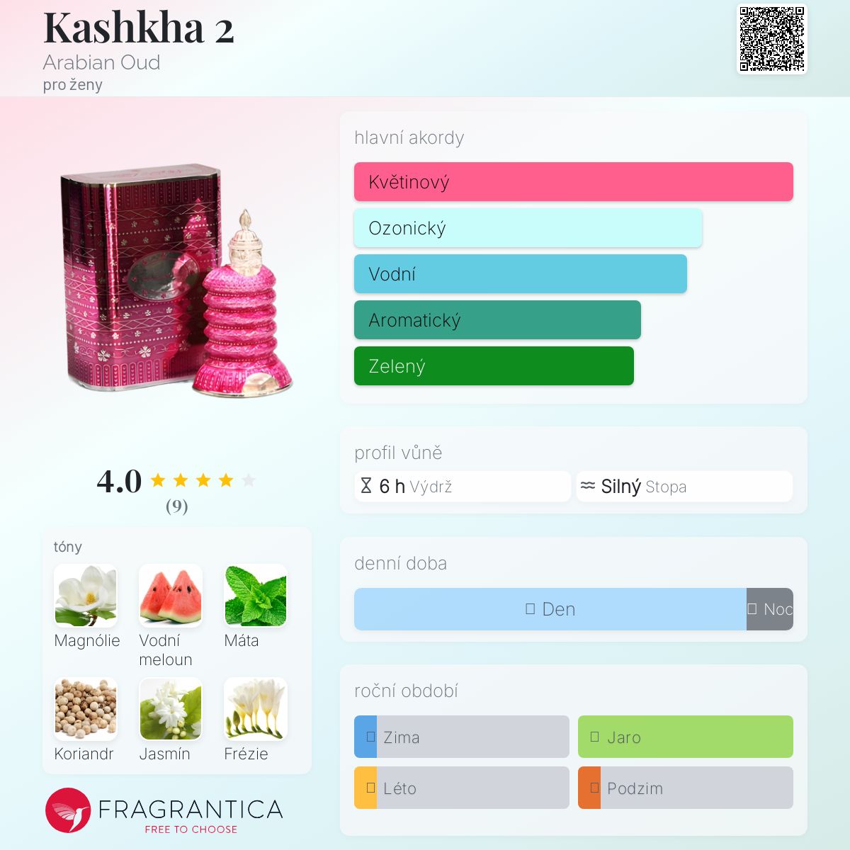 Kashkha 2 podle Arabian Oud je Floral Green vůně pro ženy. Vrchní tóny jsou Vodní meloun a Máta; střední tóny jsouMagnólie a Koriandr ; základní tóny jsou Egyptský jasmín a Frézie.