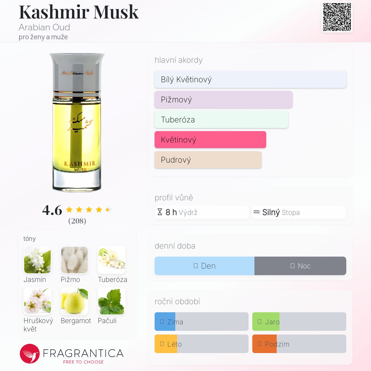 Kashmir Musk podle Arabian Oud je Aromatic vůně pro ženy a muže. Kashmir Musk byl/a uveden/a v roce 2020. Vrchní tóny jsou Hruškový květ, Bergamot a Růžový pepř; střední tóny jsouJasmín a Tuberóza ; základní tóny jsou Pižmo a Pačuli.