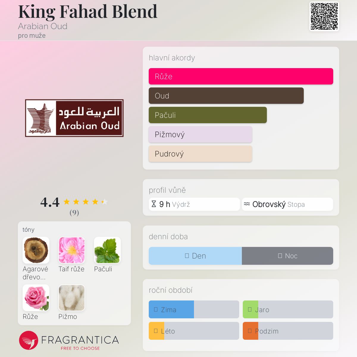King Fahad Blend podle Arabian Oud je Orientální vůně pro muže. Vrchní tón je Agarové dřevo (oud) ; střední tóny jsouTaif růže a Černé pižmo ; základní tóny jsou Pačuli a Damašská růže.