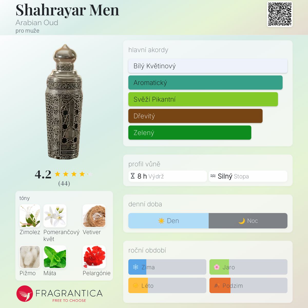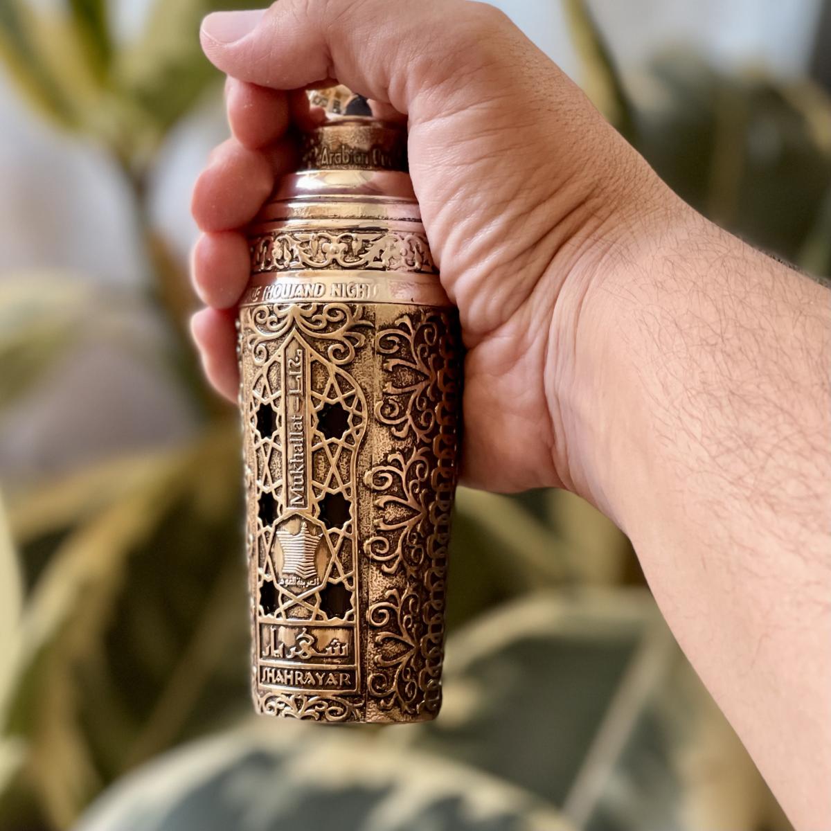 Shahrayar Men podle Arabian Oud je Orientální Fougere vůně pro muže. Vrchní tóny jsou Zimolez, Pomerančový květ a Máta; střední tóny jsouVetiver, Pelargónie, Muškátový oříšek a Fialka ; základní tóny jsou Bílé pižmo, Papyrus, Jantar (ambra) a Vanilka.