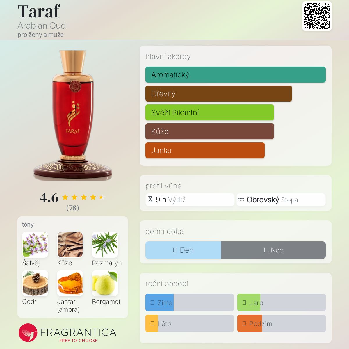 Taraf podle Arabian Oud je vůně pro ženy a muže. Taraf byl/a uveden/a v roce 2023. Vrchní tóny jsou Šalvěj a Bergamot; střední tóny jsouRozmarýn a Bulharská růže ; základní tóny jsou Kůže, Cedr a Jantar (ambra).