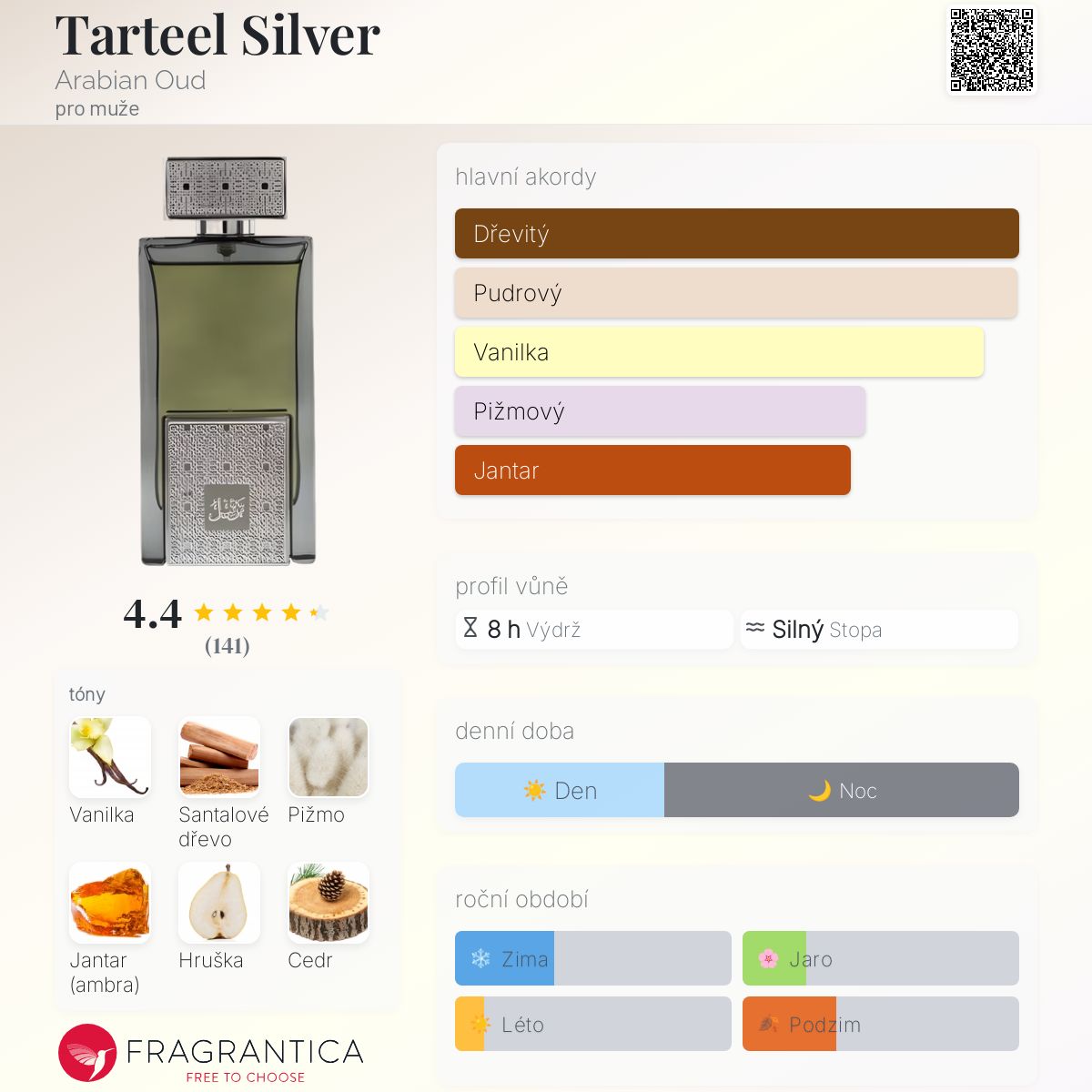 Tarteel Silver podle Arabian Oud je Aromatic vůně pro muže. Tarteel Silver byl/a uveden/a v roce 2017. Vrchní tóny jsou Hruška a Bergamot; střední tóny jsouCedr, Lotus a Jasmín ; základní tóny jsou Vanilka, Santalové dřevo, Pižmo a Jantar (ambra).
