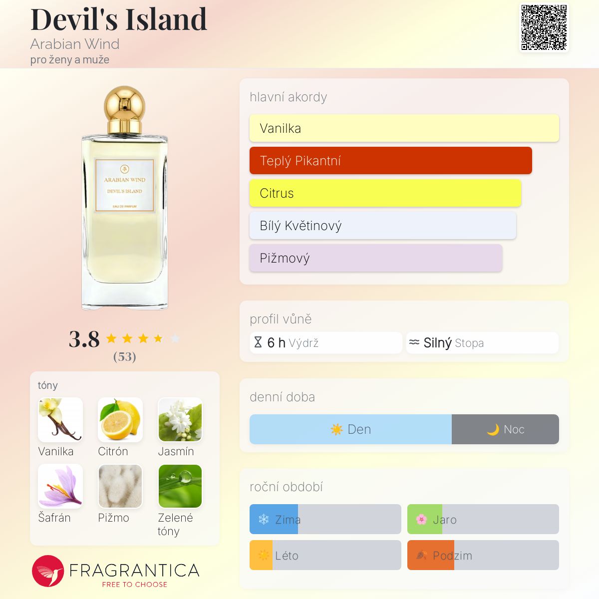 Devil's Island podle Arabian Wind je Orientální Floral vůně pro ženy a muže. Devil's Island byl/a uveden/a v roce 2023. "Nosem" za touto vůní je Nejla Barbir. Vrchní tóny jsou Citrón a Zelené tóny; střední tóny jsouJasmín, Šafrán, Růže a Kadidlo ; základní tóny jsou Vanilka, Pižmo, Agarové dřevo (oud) a Pačuli.