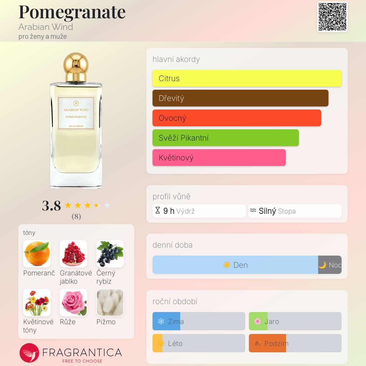 Pomegranate podle Arabian Wind je Floral Woody Musk vůně pro ženy a muže. Pomegranate byl/a uveden/a v roce 2023. Pomegranate byl/a vytvořen/a Marzia Tissino a Karen Hakobyan. Vrchní tóny jsou Pomeranč, Granátové jablko, Černý rybíz a Květinové tóny; střední tóny jsouRůže a Pižmo ; základní tóny jsou Jantar (ambra) a Solární tóny.