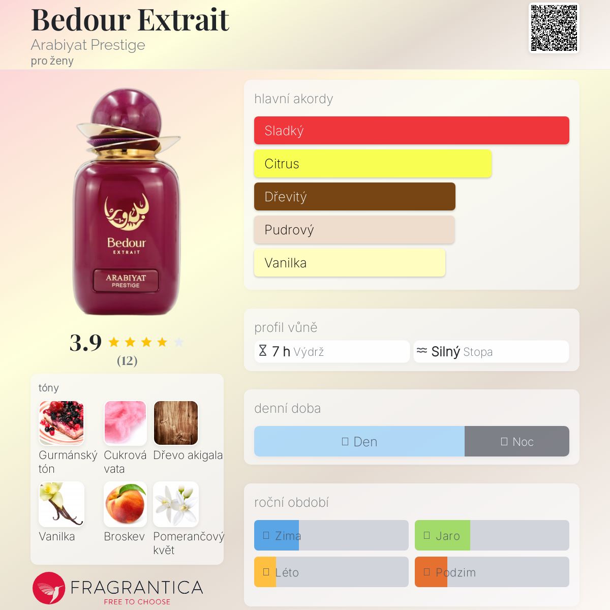 Bedour Extrait podle Arabiyat Prestige je vůně pro ženy. Bedour Extrait byl/a uveden/a v roce 2023. "Nosem" za touto vůní je Nathalie Templer. Vrchní tóny jsou Bílá broskev, Mandarinka a Bergamot; střední tóny jsouGurmánský tón, Pomerančový květ a Vetiver ; základní tóny jsou Cukrová vata, Dřevo akigala, Vanilka a Pižmo.