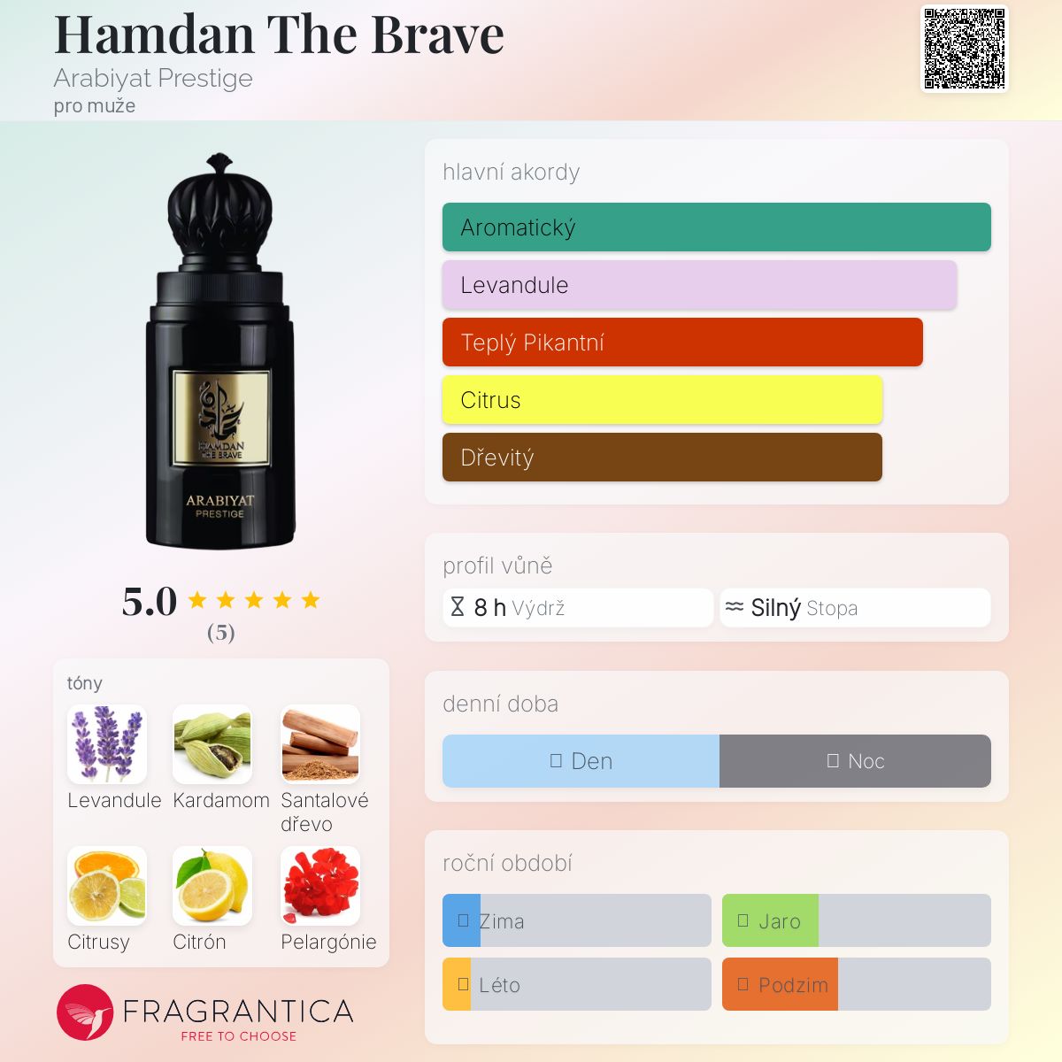 Hamdan The Brave podle Arabiyat Prestige je vůně pro muže. Toto je nová vůně. Hamdan The Brave byl/a uveden/a v roce 2024. "Nosem" za touto vůní je Lucas Sieuzac. Vrchní tóny jsou Kardamom, Citrusy a Citrón; střední tóny jsouLevandule a Pelargónie ; základní tóny jsou Santalové dřevo a Cedr.