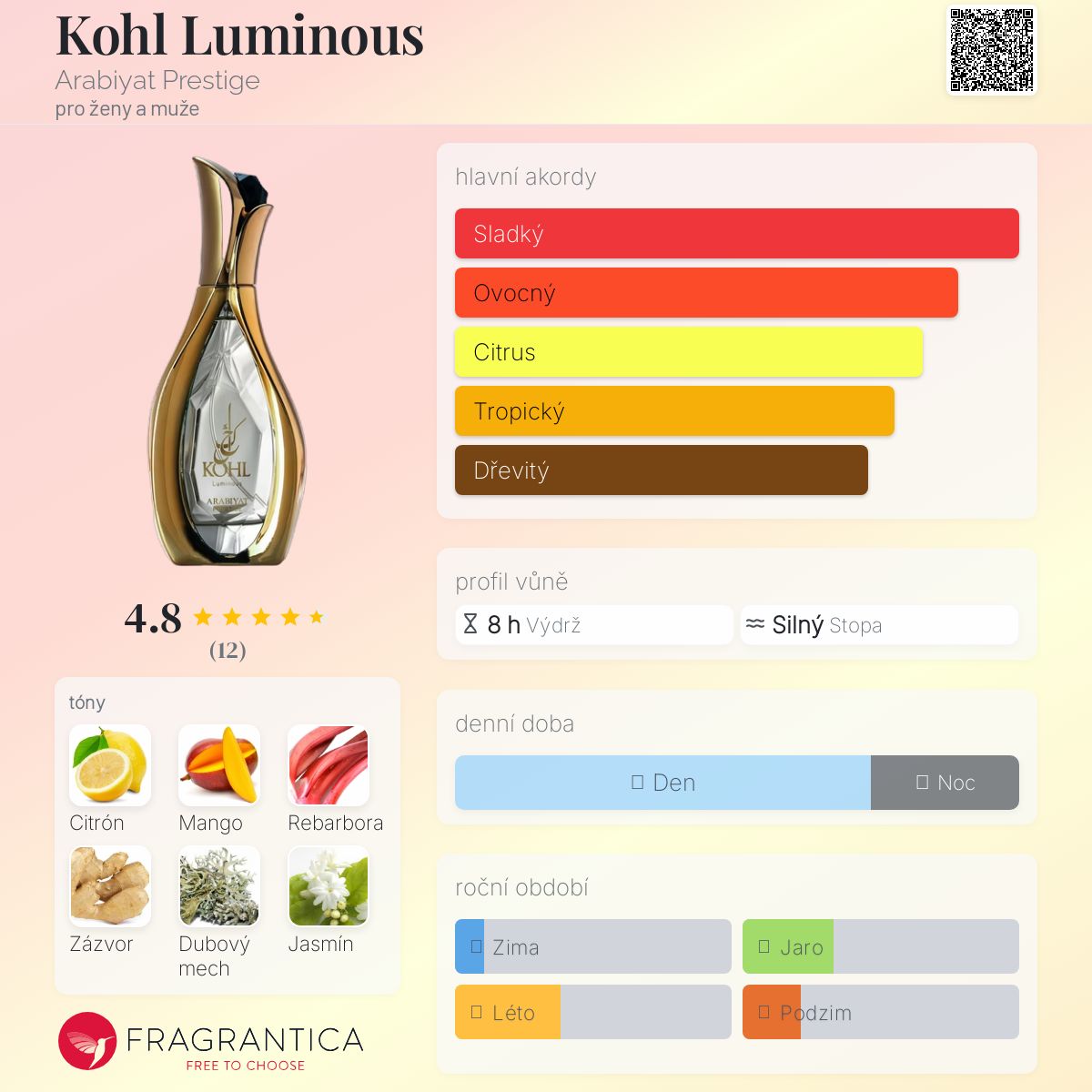 Kohl Luminous podle Arabiyat Prestige je Floral Fruity Gourmand vůně pro ženy a muže. Toto je nová vůně. Kohl Luminous byl/a uveden/a v roce 2025. Vrchní tóny jsou Citrón, Mango, Rebarbora a Zázvor; střední tóny jsouJasmín, Pralinka, Fialka a Růžový pepř ; základní tóny jsou Mech, Fazole tonka, Ambra a Cedr.