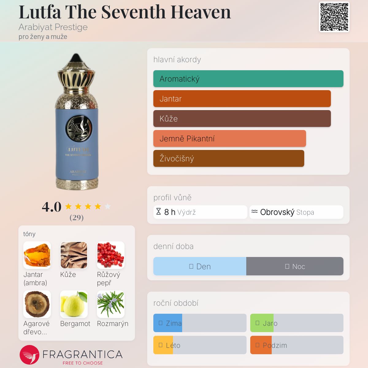 Lutfa The Seventh Heaven podle Arabiyat Prestige je vůně pro ženy a muže. Toto je nová vůně. Lutfa The Seventh Heaven byl/a uveden/a v roce 2024. "Nosem" za touto vůní je House of My Perfumes. Vrchní tóny jsou Růžový pepř, Sicilský bergamot a Davana; střední tóny jsouBílý jantar (ambra), Agarové dřevo (oud) a Rozmarýn ; základní tóny jsou Kůže, Haitský vetiver a Pižmo.