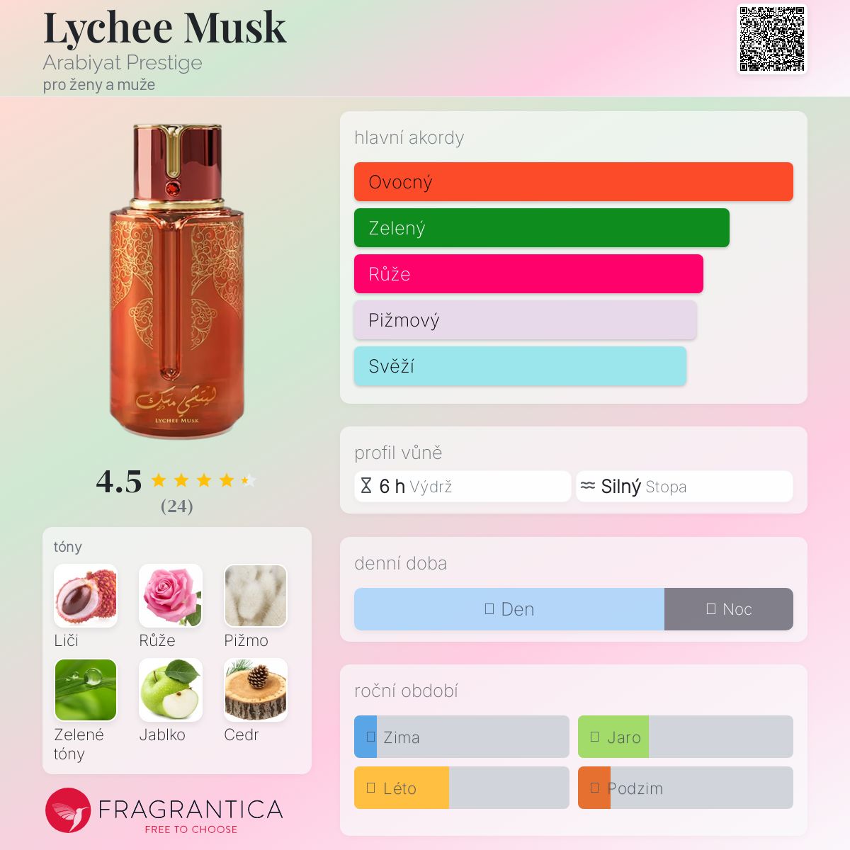 Lychee Musk podle Arabiyat Prestige je Floral Woody Musk vůně pro ženy a muže. Toto je nová vůně. Lychee Musk byl/a uveden/a v roce 2025. Vrchní tóny jsou Liči, Zelené tóny a Jablko; střední tón jeRůže ; základní tóny jsou Pižmo, Cedr, Vanilka a Karamel.