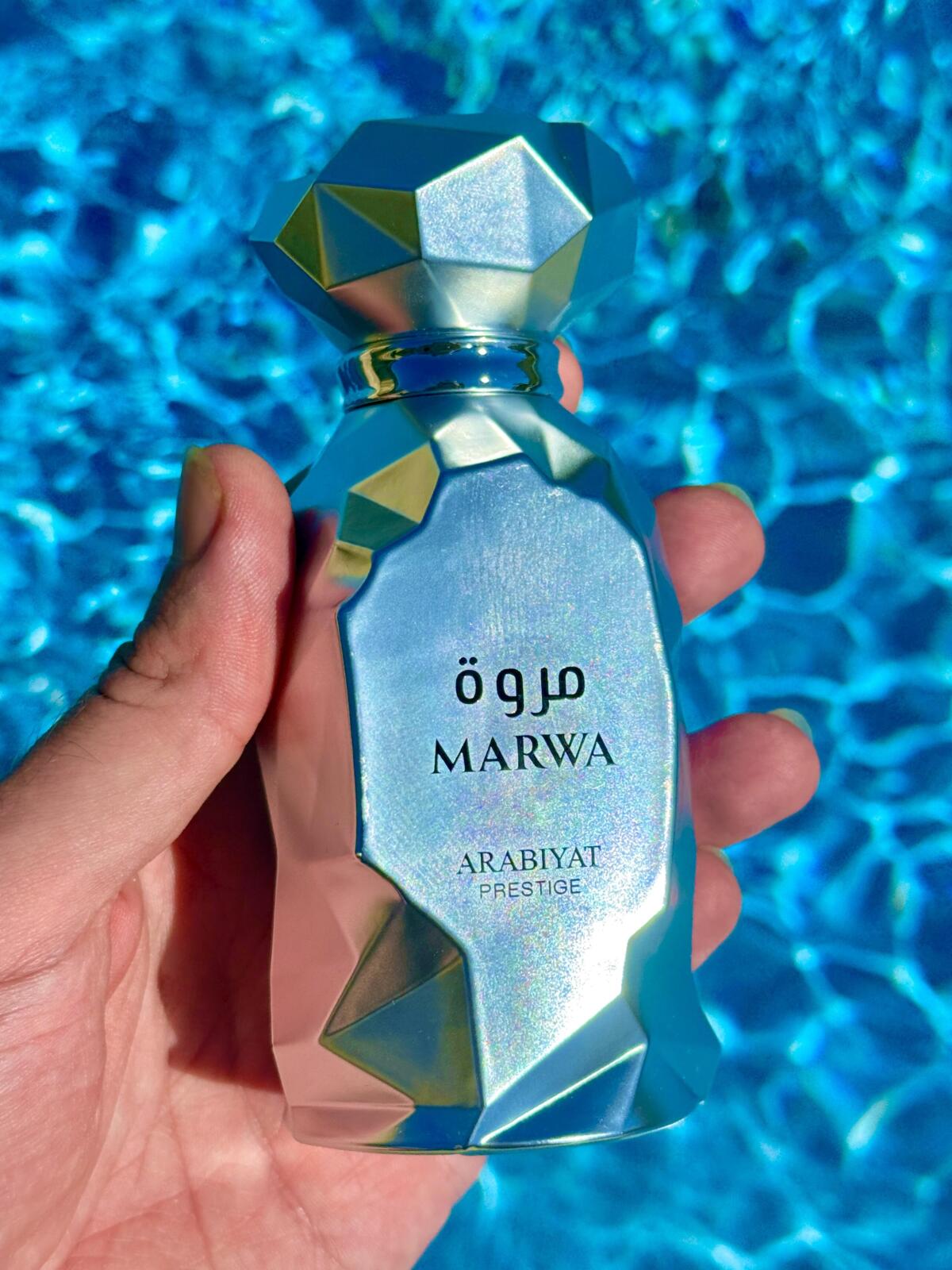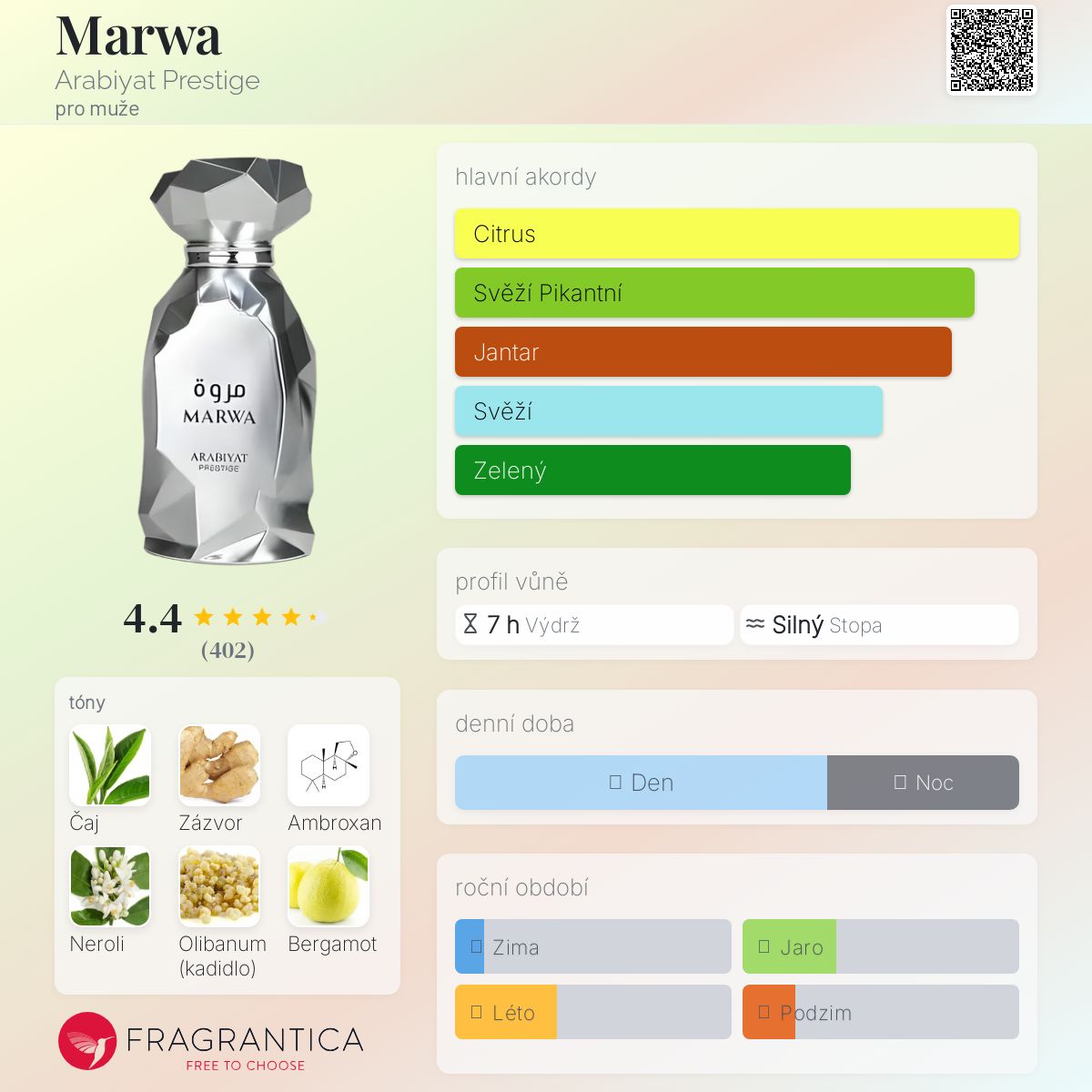 Marwa podle Arabiyat Prestige je Citrus Aromatic vůně pro muže. Toto je nová vůně. Marwa byl/a uveden/a v roce 2025. Vrchní tóny jsou Kalábrijský bergamot, Citrón a Sicilský pomeranč; střední tóny jsouNigerijský zázvor, Tuniské neroli a Cejlonská skořice ; základní tóny jsou Čínský černý čaj, Ambroxan, Olibanum a Guajakové dřevo.
