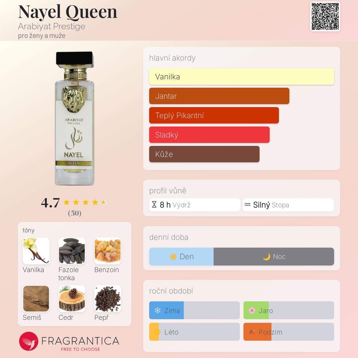 Nayel Queen podle Arabiyat Prestige je vůně pro ženy a muže. Nayel Queen byl/a uveden/a v roce 2023. "Nosem" za touto vůní je House of My Perfumes. Vrchní tóny jsou Černý pepř, Tabák a Růžový pepř; střední tóny jsouCedr a Šafrán ; základní tóny jsou Vanilka, Fazole tonka, Benzoin a Semiš.