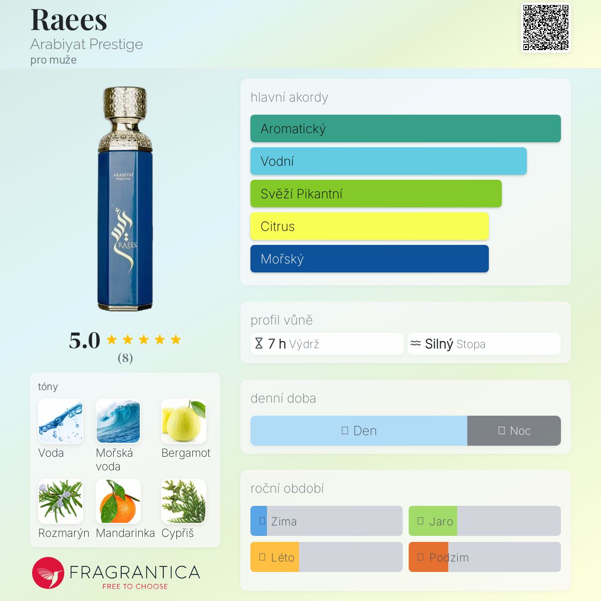 Raees podle Arabiyat Prestige je Aromatic Fougere vůně pro muže. Toto je nová vůně. Raees byl/a uveden/a v roce 2025. "Nosem" za touto vůní je Mustafa Firoz. Vrchní tóny jsou Bergamot, Rozmarýn, Mandarinka a Cypřiš; střední tóny jsouVodnaté tóny, Mořské tóny, Pelargónie a Jablko ; základní tóny jsou Pačuli a Pižmo.