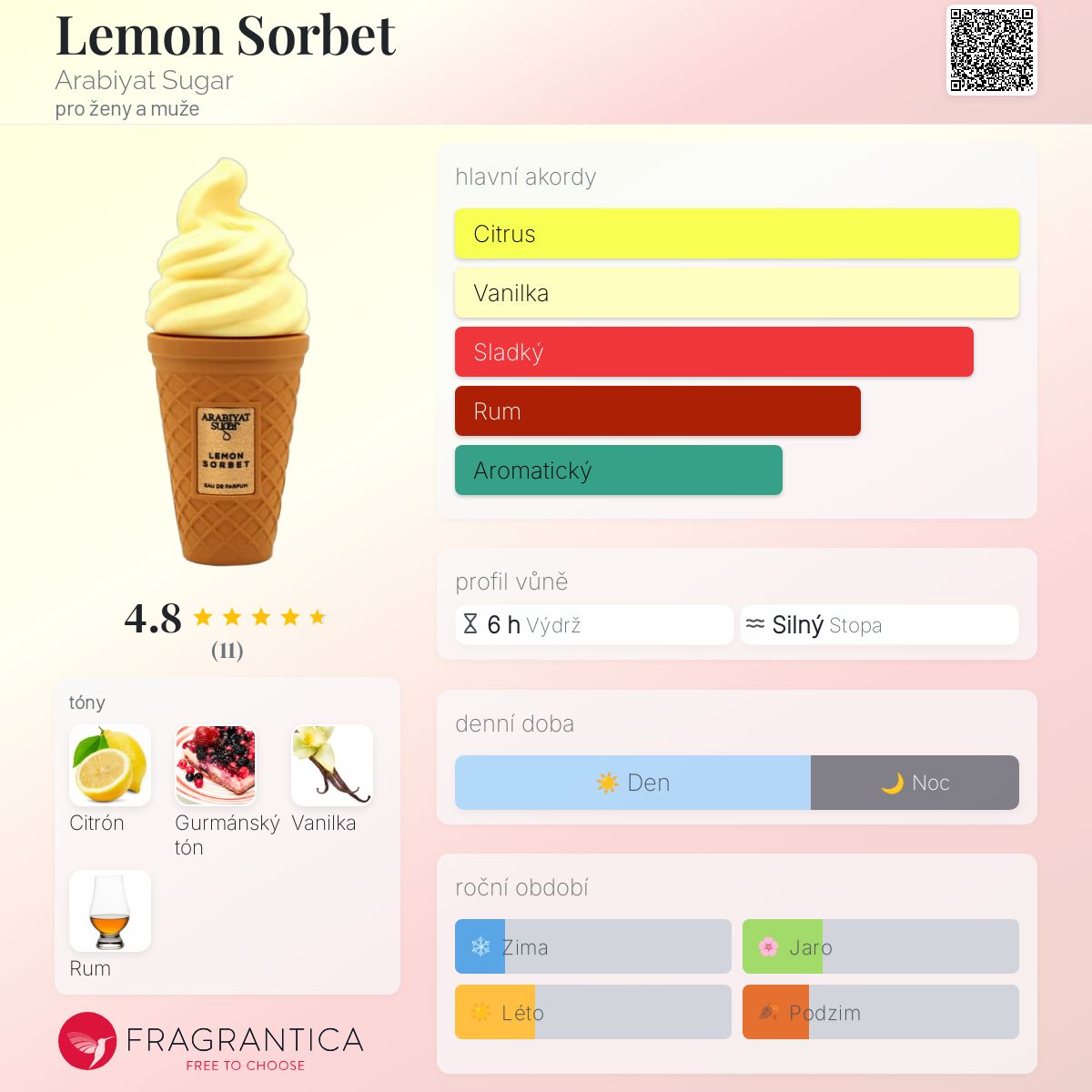 Lemon Sorbet podle Arabiyat Sugar je Orientální Vanilla vůně pro ženy a muže. Toto je nová vůně. Lemon Sorbet byl/a uveden/a v roce 2025. "Nosem" za touto vůní je Mustafa Firoz. Vrchní tóny jsou Citrón a Rum; střední tón jeGurmánský tón ; základní tón je Vanilka.